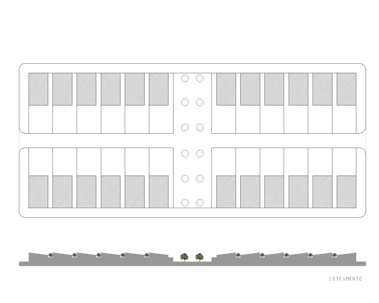Propôs-se um conjunto com uma configuração geométrica ortogonal, com formas básicas repetitivas e uma escala, edificações e acessos, adequada às vivências locais.